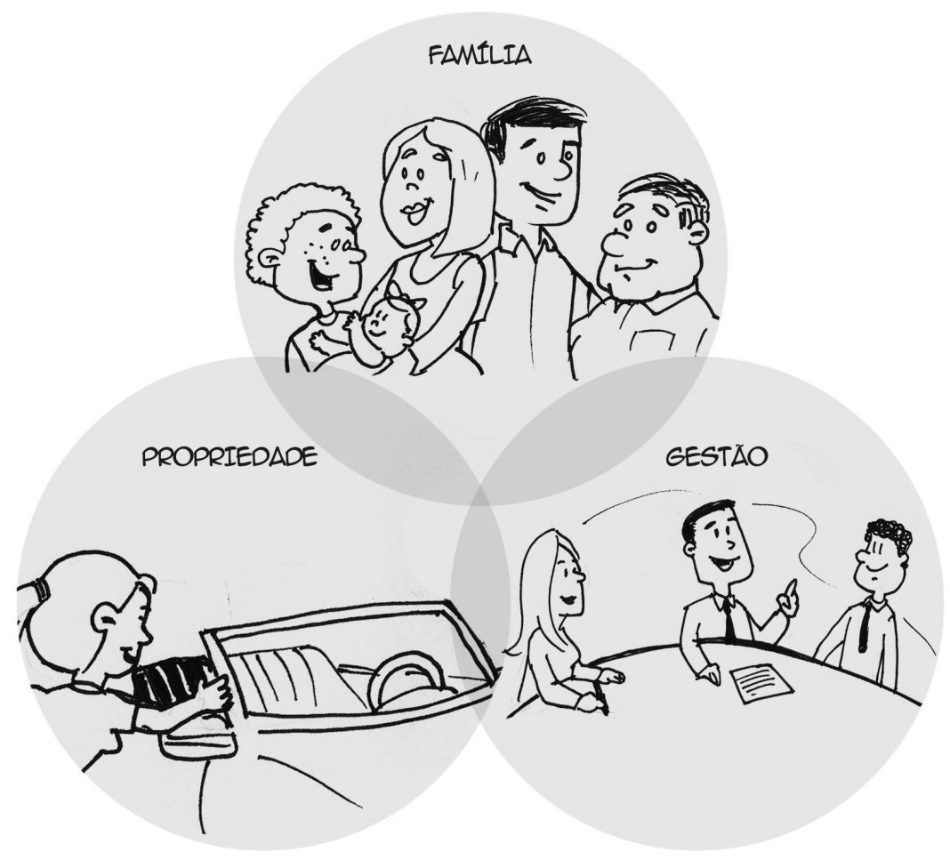 Família (relacionamentos, expectativas, emoções), propriedade (poder de voto, liquidez, proteção patrimonial) e negócio (liderança, estratégia, resultados). É o Modelo dos 3 Círculos de John Davis se transformando em 3 ilhas.